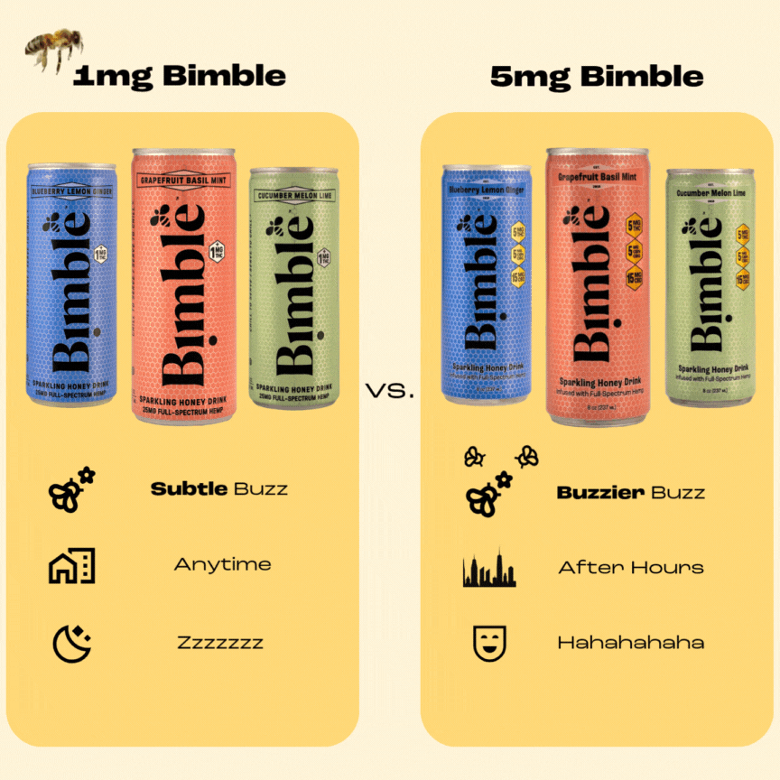 Bimble is a premium Full Spectrum Hemp drink with a unique 25mg cannabinoid blend and a micro dosed amount of THC, either 1mg or 5mg. It is low calorie, all natural, preservative free and tastes great.